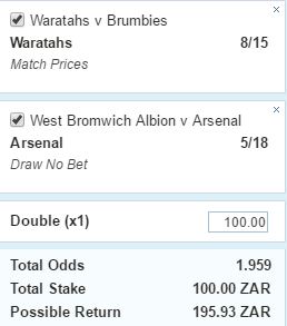 The second leg is for an under pressure Arsenal to beat West Brom (or at worst draw) at 5/18 as the Gunners have won 4 of their last 5 against the Baggies. So our weekly bet is Waratahs to beat the Brumbies onto Arsenal Draw no bet against West Brom at a shade over 19/20. Bet HERE