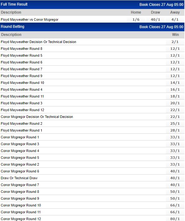 Please note betting odds quoted are correct at time of publication and are subject to change. View the latest Mayweather vs McGregor odds