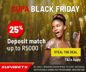 Supabets always has great offers and promotions for Black Friday, and 2022 is no different. Their 2022 Black Friday special is a draw to win a share of R100,000 and a 25% deposit match bonus on all deposits up to R5000!