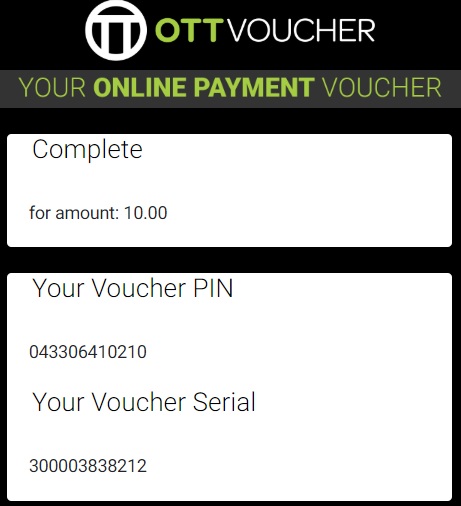 - When all the requested details are entered and you’ve clicked submit you’ll need to wait until the payment is complete and you issued a voucher pin and voucher serial number. These are the details you’ll need to use to redeem your OTT voucher so take a screenshot or write the pin and serial down for later use,