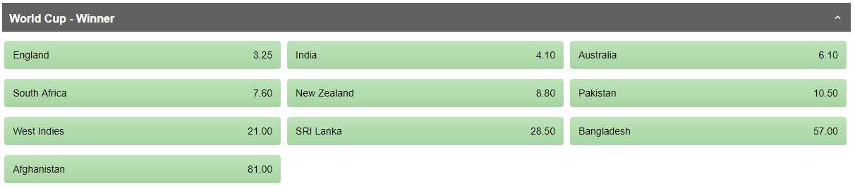 Cricket World Cup 2019 Betting Odds (Pre Tournament)
