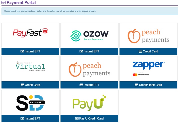 5. Payment Portal: Instant EFT from your mobile application through: OZOW, PayFast, Zapper, Peach Payment, Virtual Card Services and SID.