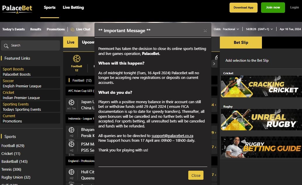 Players are strongly encouraged to withdraw any remaining funds in their PalaceBet accounts before betting is disabled. Ensuring your FICA documents are current will aid in a speedy transfer process. Any funds that are still in your Palacebet account will potentially be lost after 29 April 2024.