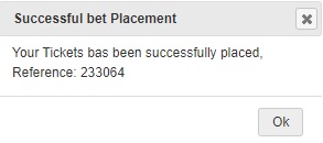 Once you have submitted the bet you will see a pop up telling you that your ticket was placed successfully, along with a ticket reference number. You can view your currently tickets by going back to the WSB lottery lobby and clicking on Ticket History.