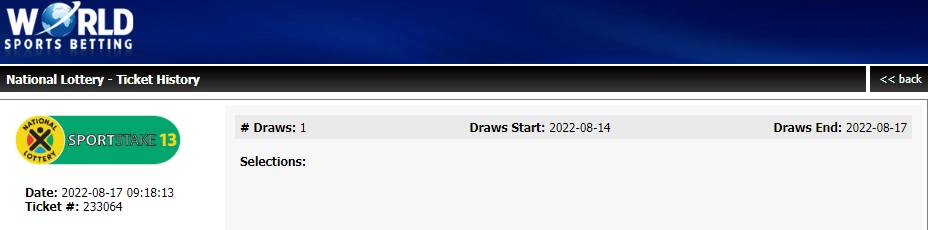 Once you’ve clicked on ticket history you will see your placed bets and selections. The selections do take a bit of time to reflect, so give it a few minutes if they are not displaying. You can also view the results for all Lotto draws and Sportstake on the WSB Lotto lobby.