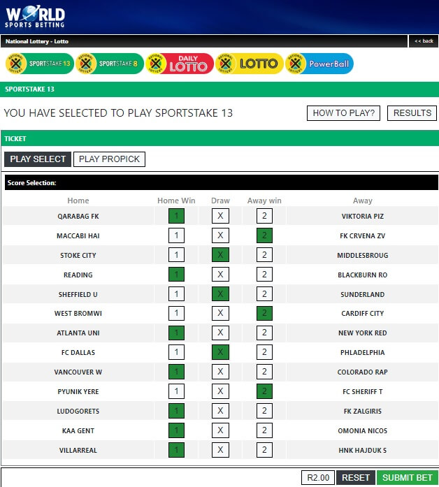 Open the applicable Fixture List for the SPORTSTAKE 13 game and predict your outcome for each of the 13 soccer matches.[1] – for a Home Win [x] – for a Draw [2] – for a Home Loss (Away Win). A single board entry costs R2.00. A Multi-Play bet cost is calculated by multiplying the number of boards with R2.00.