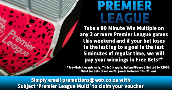 Take a 90 Minute Win Multiple on any 3 Premier League games and get your winnings in free bets if your bet loses in the last leg to a late goal. WSB also have a R50 free bet bonus for new customers who open an account. Read more about World Sports Betting.