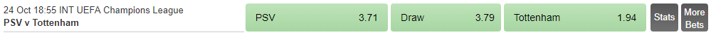 PSV v Tottenham Hotspurs Betting Tips