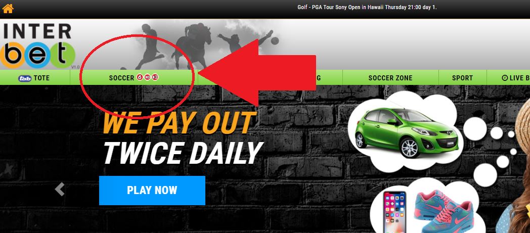 To Bet on Soccer 6 go to the Interbet site and click the Soccer 6 tab as described in the screenshot below.